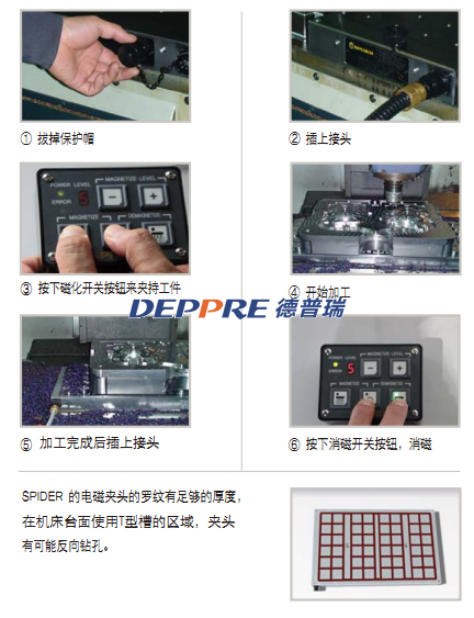 SPIDER的電磁夾頭不需要額外的安裝費(fèi)用和操作技術(shù)。插上插頭,并按下磁化的開關(guān)按鈕,工作被磁化固定在夾頭上,在拔掉接頭后可立刻開始加工。如果要把工件從夾頭上拿下來。再次插上接頭,打開消磁的開關(guān),工件立刻從夾頭上脫離下來。即使在磁化后拔下接頭,夾頭也是永久保持磁性的,這樣工件可以安全地固定在夾頭上。